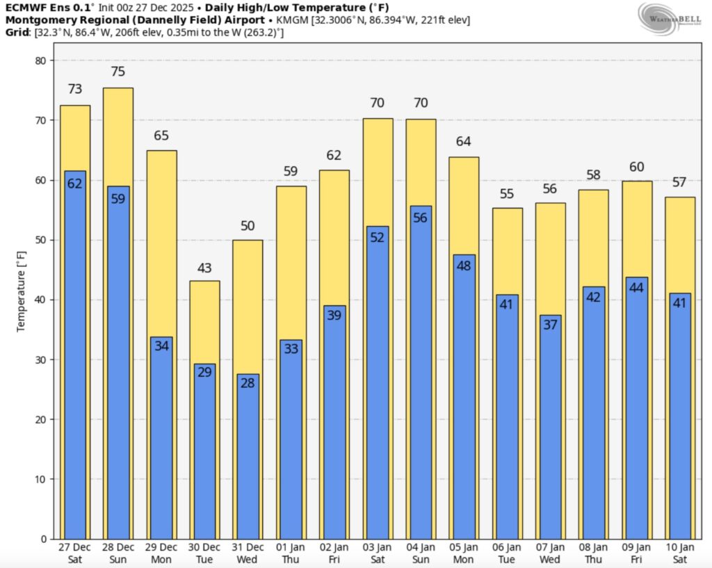 Good Morning! Today we’ll be well up in the 70s for the 5th day in a row. High 76 today. Even on Sunday we’re projecting 77 degrees. The weekend will be storm-free dry and warm with a sun and cloud mix. ENJOY this comfortable weather. Some parts of the country have had miserable Christmas week weather with storms. Our much above normal temperatures will go away in the not too distant future. An approaching strong cold front will bring scattered showers by late Sunday night and half the day Monday, followed by a major Arctic plunge. Monday will be a day of falling temperatures. Monday night we’ll plunge to the 20’s. Tuesday’s high will only be in the lower 40’s. Wednesday morning looks bitterly cold in the lower 20’s.