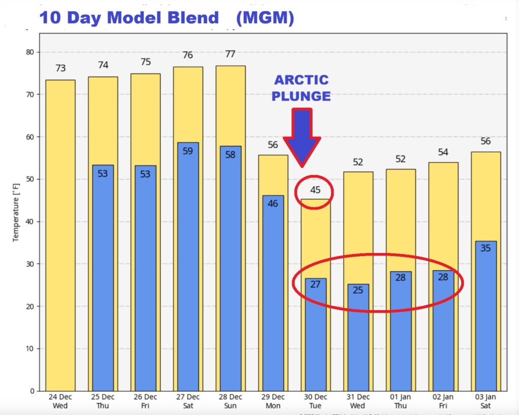 WEDNESDAY Update:  Spring-like Christmas – 70+ through Sunday – Major Arctic Plunge By Monday