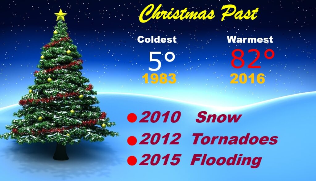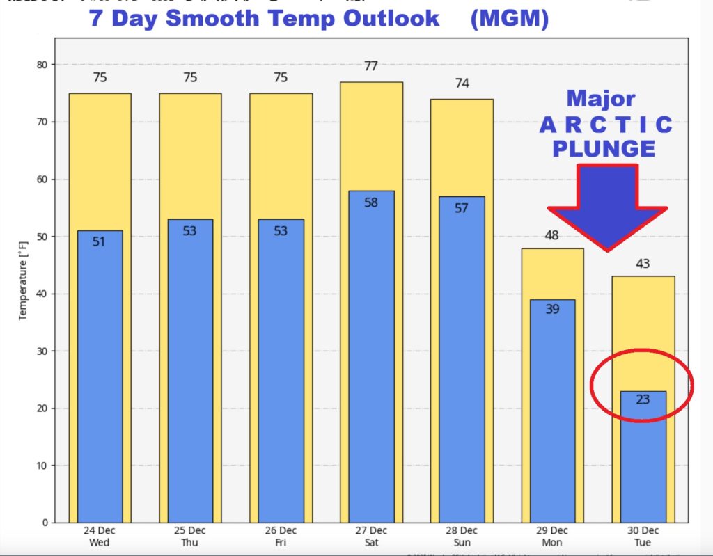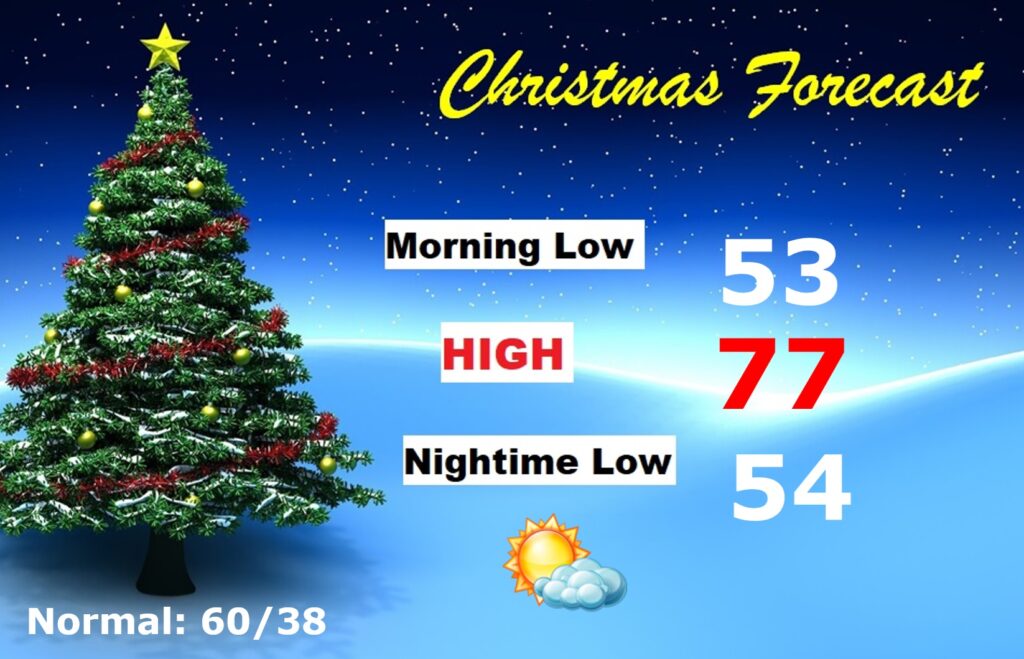 Good Morning!  What a holiday treat!  It’s an absolutely phenomenal Christmas Day forecast.  It’s not only a storm-free/Dry forecast.  Much above normal temperatures start today.  Highs well into the 70’s are expected through Sunday. But, hang on cold weather fans.  An approaching cold front will bring scattered showers by Sunday PM, followed by a major Arctic plunge.  Monday & Tuesday will be in the 40’s.  Tuesday and Wednesday morning looks bitterly cold.  A complete change of wardrobe.  Here’s my brief video Forecast Discussion.