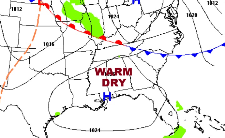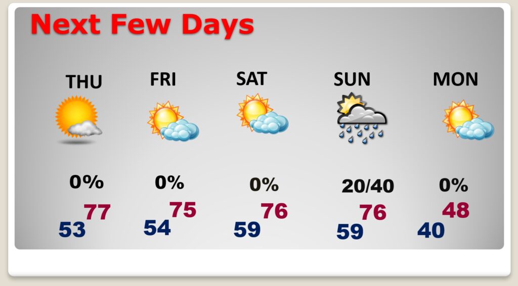 NEXT FEW DAYS:    Dry through Saturday.  Highs in the 70’s are expected today through Sunday. But, hang on cold weather fans.  Your time is coming.