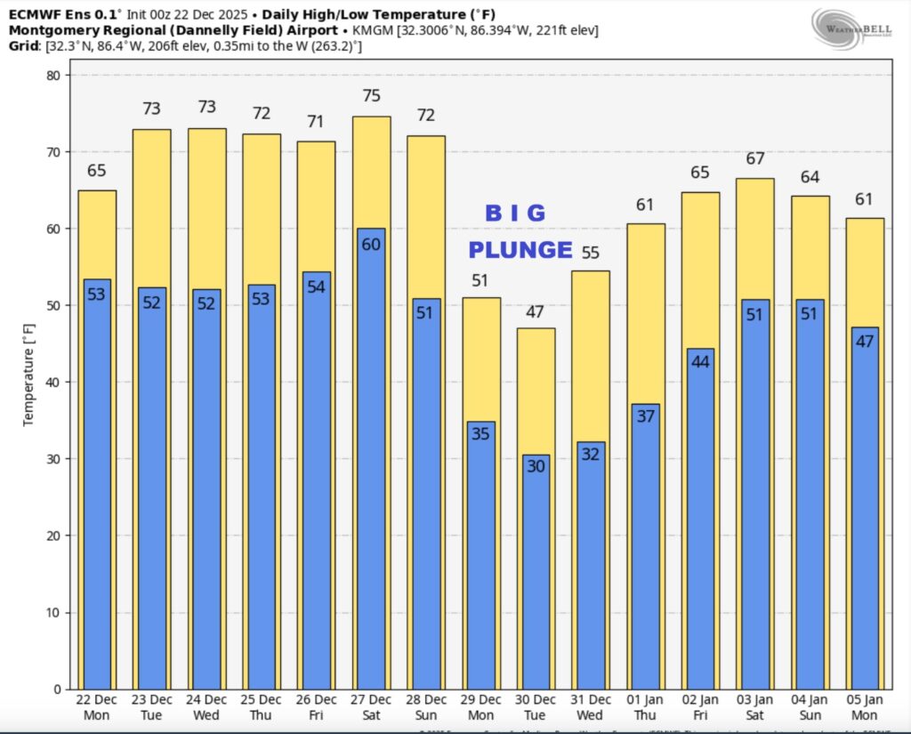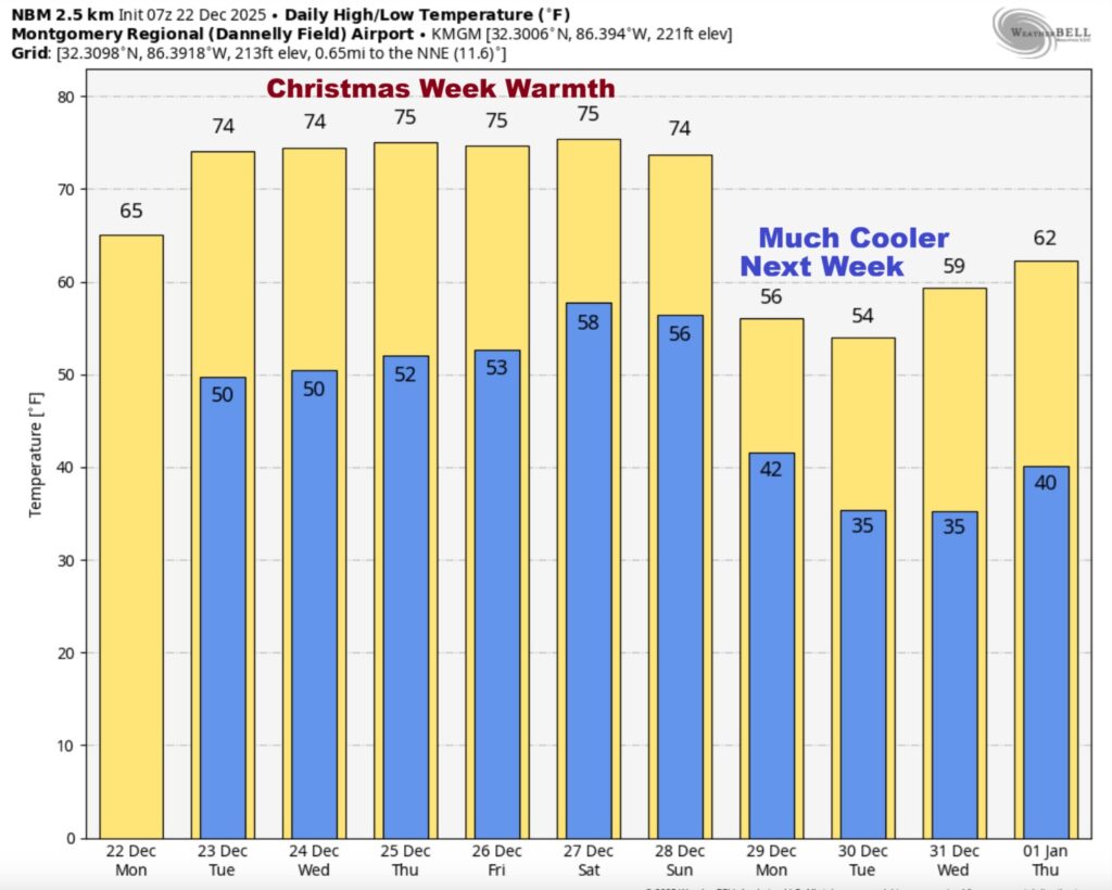 Take a look at the projected high temperatures across the Southeast US Christmas afternoon.  Attention Santa:  Don’t forget your shorts for your Alabama visit.