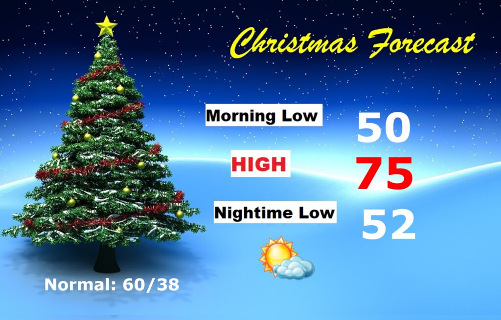 NEXT FEW DAYS:    Storm-free and dry on this Christmas Week. Highs in the 70’s are expected Tuesday through Sunday.   Lows at night mostly in the lower 50’s.  (Normal 61/38)
