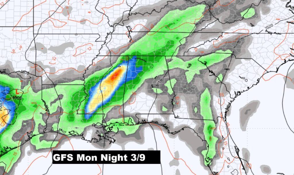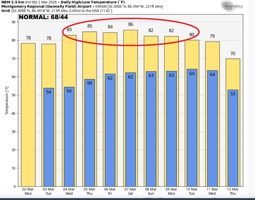 Good Morning! Alabama has a rather remarkable warm string of days ahead of us on this first week of the month of March. Highs are expected in the upper 70’s again today after 78° at MGM yesterday. The warming will continue. Wednesday through Saturday, at least, we’ll be in the lower 80’s. A couple of upper air disturbances will bring the risk of spotty showers and thunderstorms to the forecast Thursday and Friday – perhaps a little more concentrated by Saturday. Any potential Severe Weather threat will hold off for now. But we’ll be watching developments in the middle part of the country closely Wednesday and beyond. Potential “issues” here now seem delayed by the models. Stay tuned. Here’s my brief video forecast discussion.