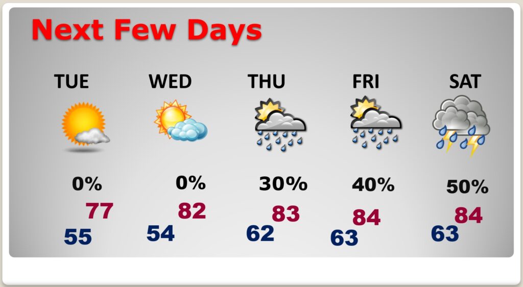 NEXT FEW DAYS: The warming continues. Wednesday through Saturday, at least, we’ll be in the lower 80’s. Nights in the 50/s/60s. A couple of upper air disturbances will bring the risk of spotty showers and thunderstorms to the forecast Thursday and Friday – perhaps a little more concentrated by Saturday.