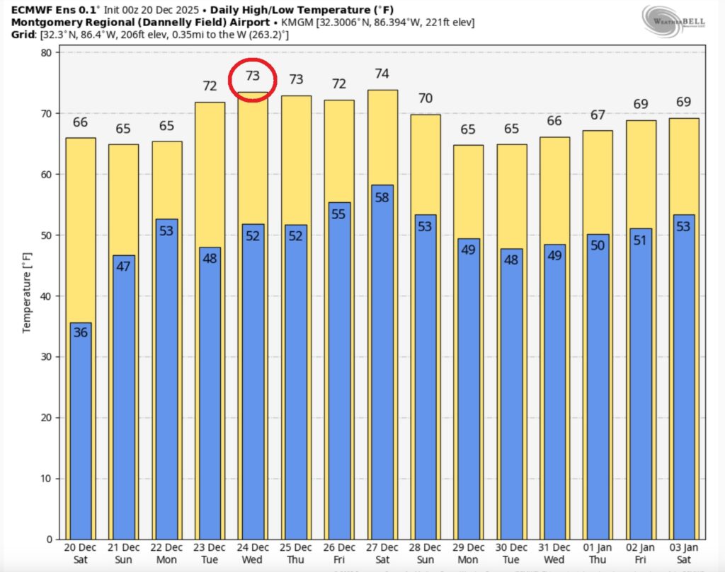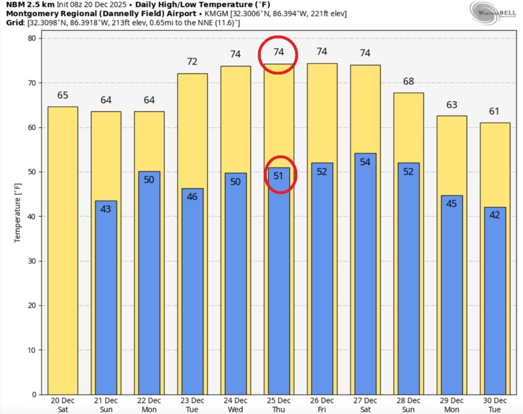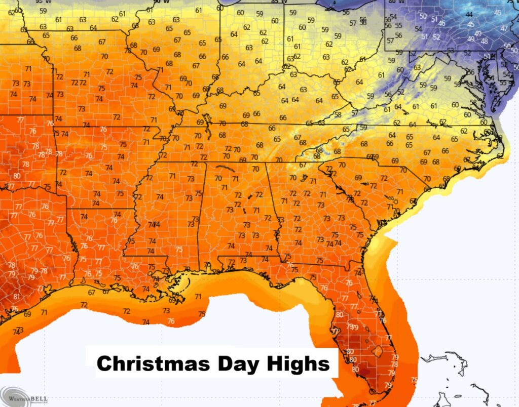 Take a look at the projected high temperatures across the Southeast US Christmas afternoon.  Very nice.