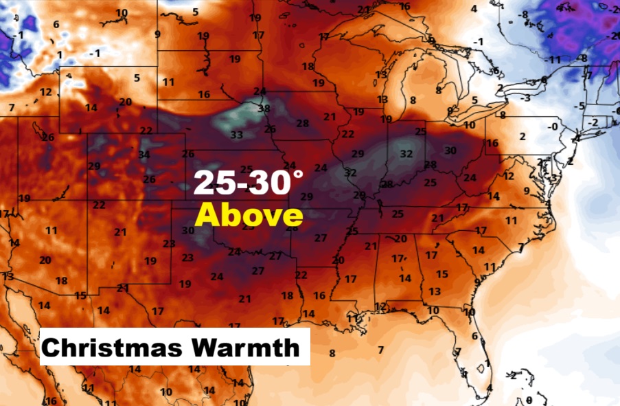 CHRISTMAS WEEK FORECAST:  Christmas Week looks amazingly warm for a huge chunk of America.  Here’s my forecast for us.   NOT BAD at all.