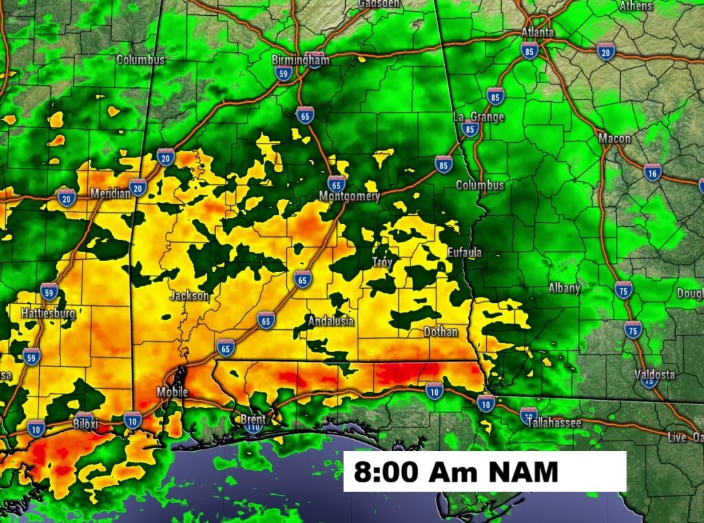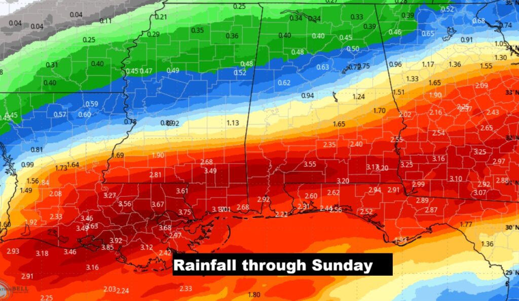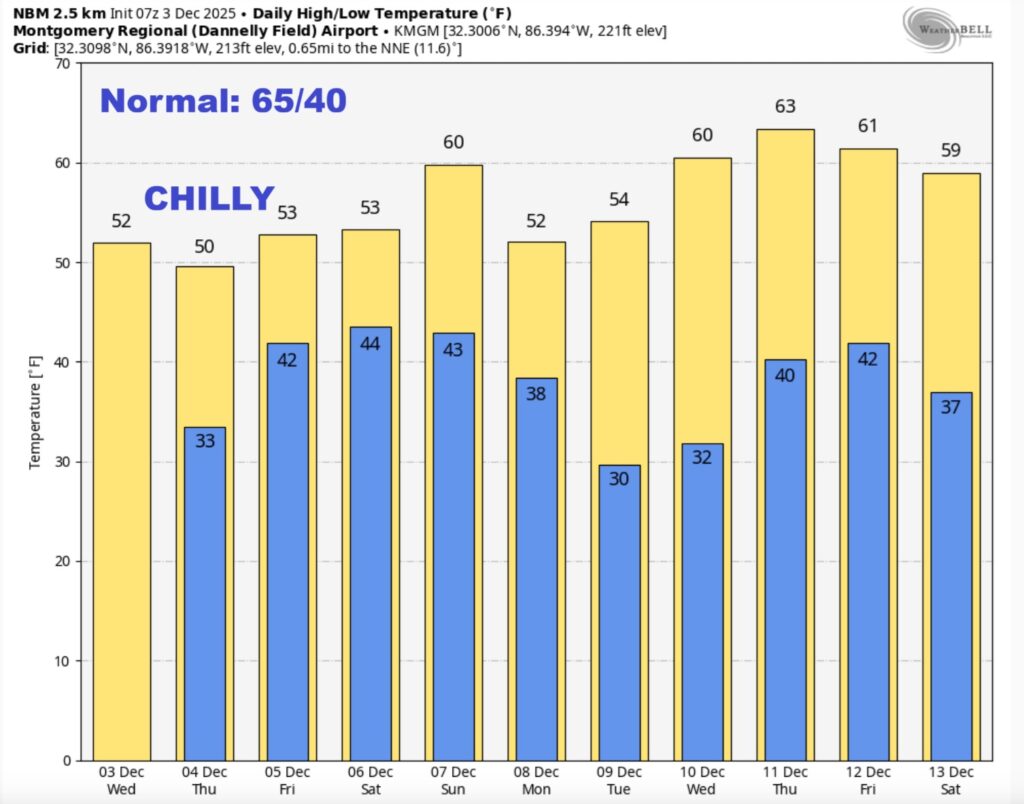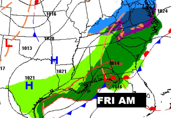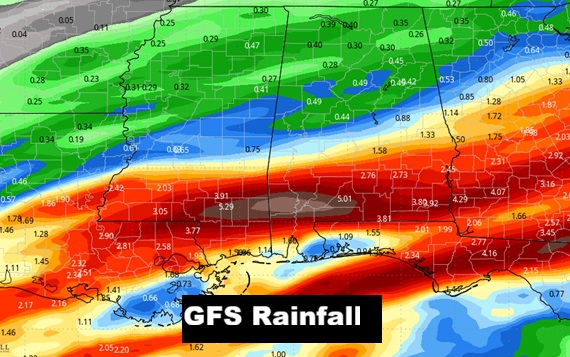 Good Morning! It’s a very chilly December forecast, and soon very wet. The first wave of rain overspreads the area this morning. There will be periods of a cold rain today through Saturday – as a series of Lows slide eastward across the Gulf coast. Leftover showers may linger into Sunday AM, too. Some of the models are advertising significant rainfall totals especially for the southern half of the state. Temperatures may fall short of 50 Today and not much above 50 Friday. We may tease 60 by Sunday, but temperature will remain below normal for several days. Here’s my brief forecast discussion.