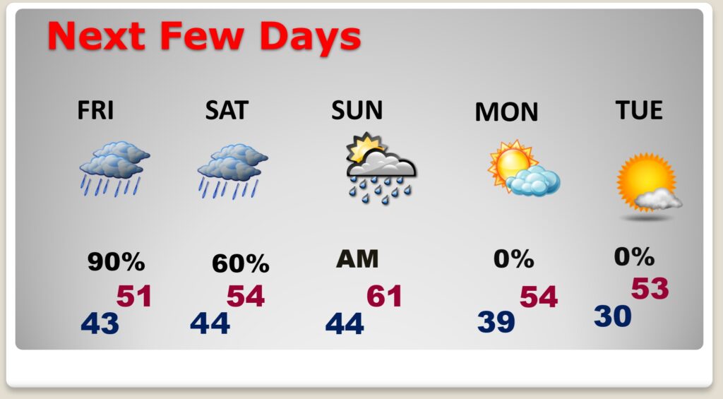 Periods of rain this morning and through mid-day before we get a break for a few hours. High only in the upper 40’s. The next wave of concentrated rain moves in tonight. Low tonight lower 40’s.
