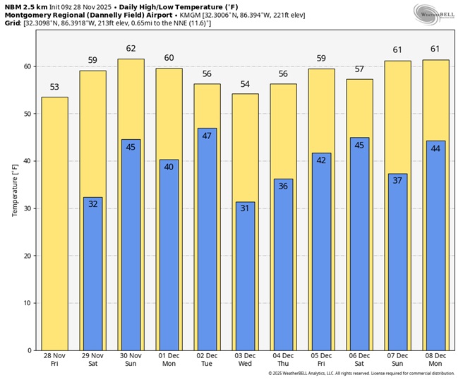 We’ll be close to a freeze by Black Friday dawn.   It will be quite cool though Iron Bowl weekend with Cold nights. (Normal hi/lo 67/41)  Next chance off rain Sunday and Monday especially Monday night into Tuesday.