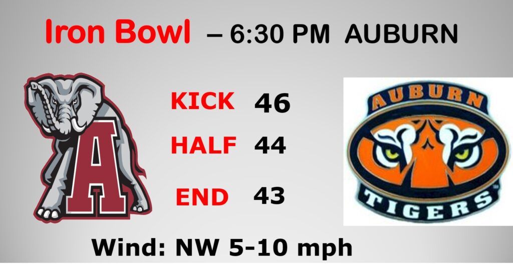 IRON BOWL: The big game is tonight in Auburn. 6:30 PM kickoff. Very cool day. High today 57. Kick off temp 46. Halftime 44 – End 42. Wind: Not a factor. NW wind 5 to 10 mph.