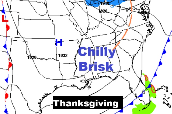 Good Morning! Happy Thanksgiving! It’s an abbreviated Blog update this morning. It’s a very cool Holiday Forecast with morning lows in the mid 30’s and an afternoon high in the mid 50’s. . Freezing on Friday and Saturday morning around Dawn. It will be well below normal through Iron Bowl Saturday. (Normal 67/41) Next chance off rain Sunday and Monday especially Monday night into Tuesday. Best chance of rain 60% Sunday and 60% Sunday Night. Here’s my quick video greeting.